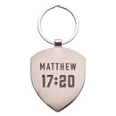 De metalen sleutelhanger: Geloof – Matteüs 17:20 is een met epoxy gevulde sleutelhanger met het woord "Geloof" en een verwijzing naar Matteüs 17:20 op de voorkant. De sleutelhanger met Matteüs 17:20 heeft ook een bergembleem op een grijze achtergrond boven de tekst "Geloof".