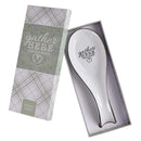 De witte keramische lepelhouder wordt geleverd met een afneembare zwarte siliconen basis. "Gather Here with a Grateful Heart" staat midden op de lepelhouder gedrukt.