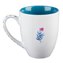 De achterkant van de mok toont een eenvoudig bloemenboeket, terwijl een bloementooi langs het oor loopt. De binnenkant is helder glanzend blauw, wat prachtig contrasteert met het wit.
