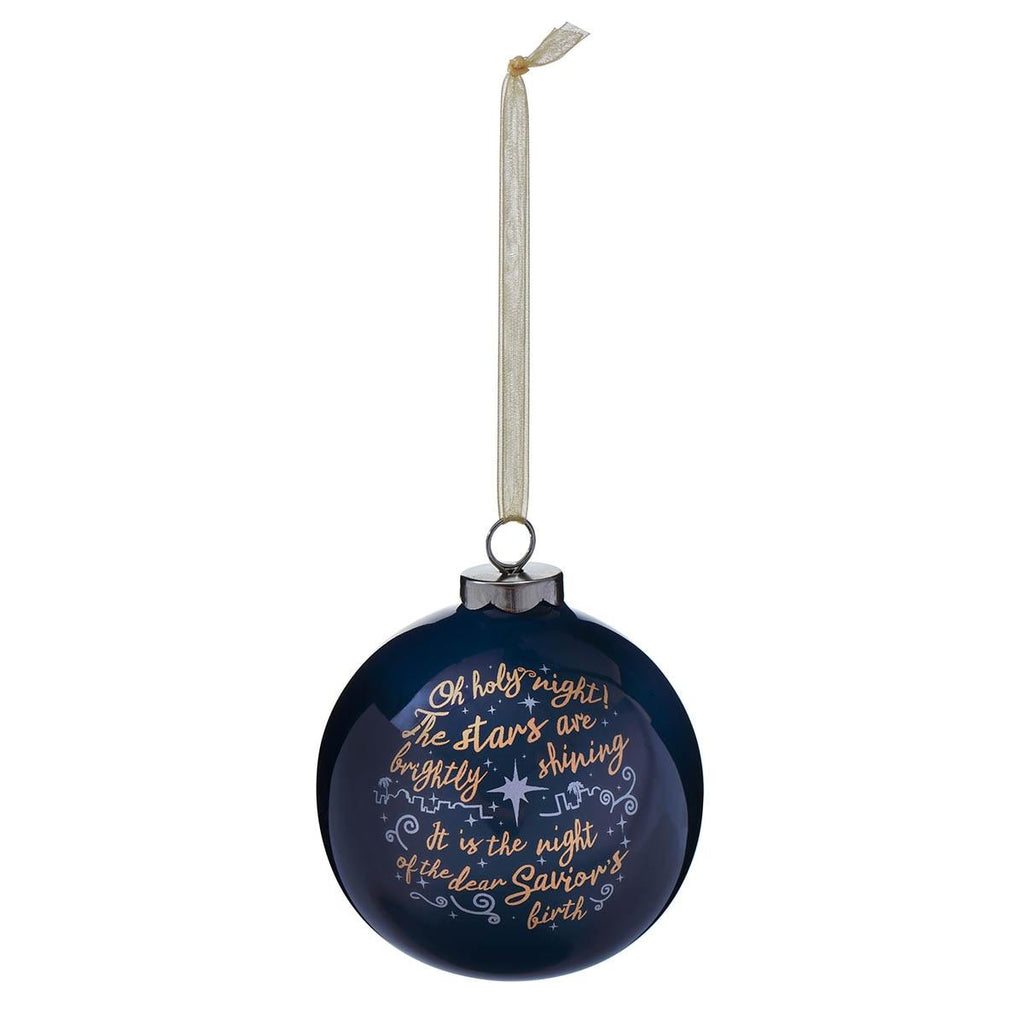 The elegant ceramic ornament has a midnight blue background. The Bethlehem star shines in the middle of the design, and blue curlicues and stars accent the picture. The gold-foiled scripted lyrics from a beloved Christmas hymn make up most of the design.