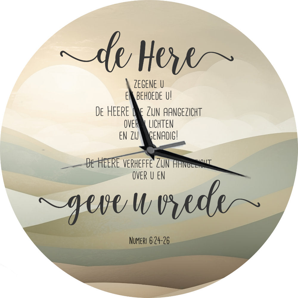 Op de wijzerplaat staat de tekst Het priesterlijk gebed, gecombineerd met een afbeelding van heuvels.
