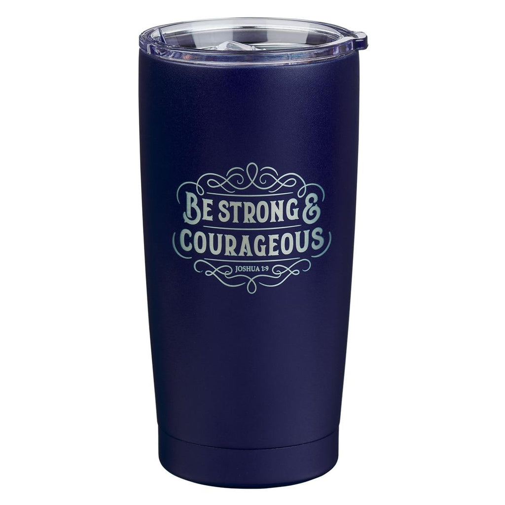 The Strong and Courageous Navy Blue Stainless Steel Travel Tumbler < i>highlights the promise that the Lord will be with us wherever we go so we can be strong and courageous. So, fill the stainless steel tumbler with a fresh brew and remember to persevere with confidence. < p>