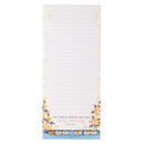 Nooit meer haasten om iets te vinden om mee te schrijven, want een bijpassend potlood met hetzelfde perzikkleurige bloemendessin wordt aan de onderkant van het notitieblok op zijn plaats gehouden door een lichtblauw elastiek. Geniet van de voldoening van het afscheuren van een pagina van het notitieblok wanneer je een taak hebt voltooid. Twee sterke magneten en een stevige kartonnen achterkant zorgen ervoor dat het notitieblok op zijn plaats blijft.