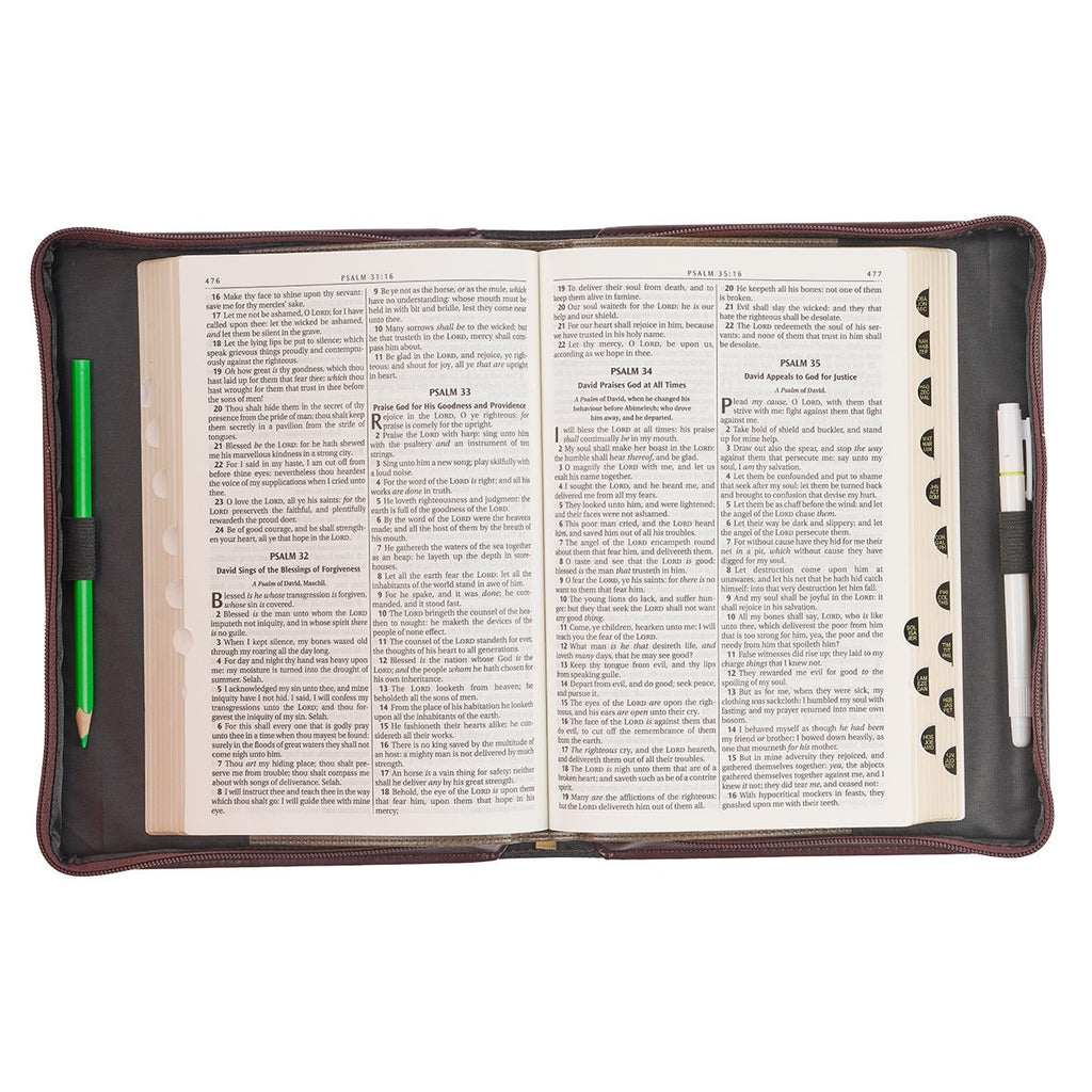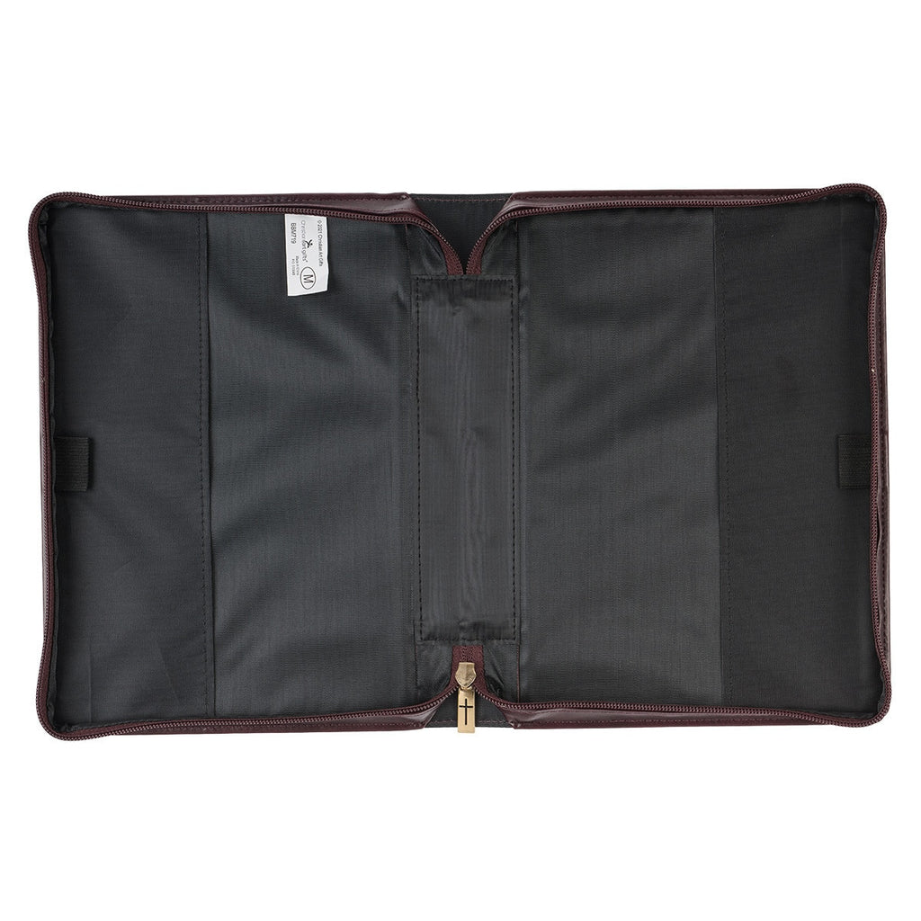 Een handige, platliggende handgreep van bruin imitatieleer is bevestigd aan de rug van deze imitatieleren Bijbelhoes met goudkleurige metalen details die passen bij de ronde, goudkleurige metalen ritstrekker met kruisgravering. Aan de achterkant bevindt zich een insteekvak met een doorgestikte rand voor het opbergen van preekaantekeningen of verskaarten. Aan de binnenkant bevinden zich twee pennenlussen om je spullen bij de hand te houden. In de linkeronderhoek van het insteekvak aan de achterkant is een roos gegraveerd.